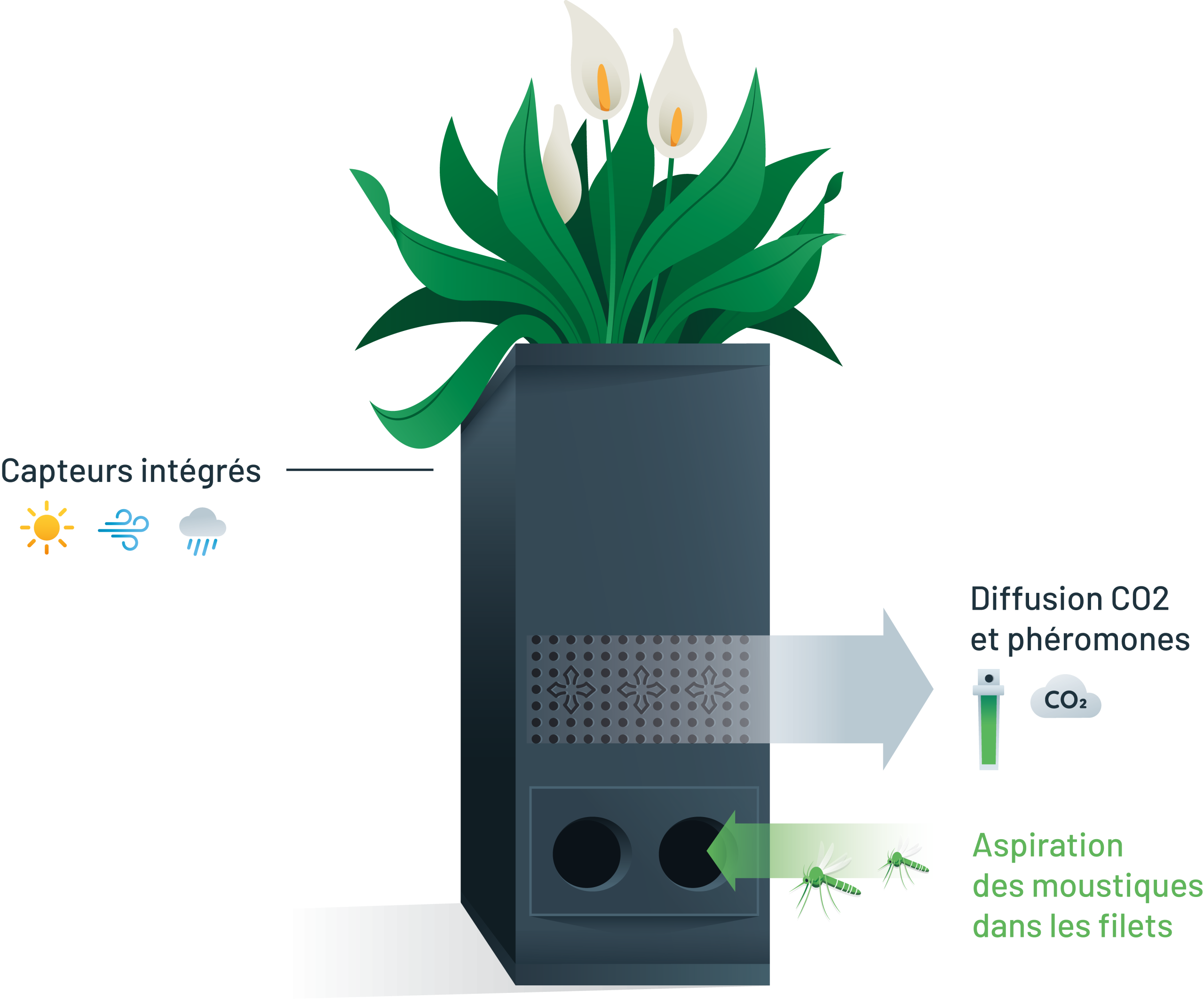 Le piège attire les moustiques en simulant la présence humaine grâce à une diffusion subtile de CO2 et de phéromones attractives. Une fois attirés par le dispositif, les moustiques sont aspirés par les deux entrées latérales et emprisonnés dans les filets de capture.
